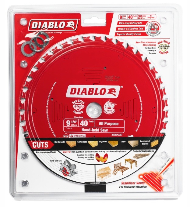 Diablo’s general purpose blade is ideal for cutting oak, pine, plywood, pressure treated lumber and beams. An excellent choice hand held saws, Diablo’s blade leaves a smooth cut in a variety of applications, reducing the need to change blades between tasks. Use it for ripcuts with a smoother finish than dedicated ripping blades, or make quality crosscuts in solid wood or plywood. Excellent for trim work and building, bookcases, cabinets, shelving, etc
