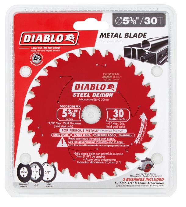 Diablo’s Steel Demon metal cutting saw blades produce fast, accurate cuts in mild steels without bogging down your cordless saw’s battery. This 20mm arbor saw blade includes three additional bushings that allow your blade to also fit on 1/2″, 5/8″ or 10mm arbor saws. These blades feature Diablo made TiCo Hi-Density Carbide engineered exclusively to deliver up to 40 times longer life when compared to one standard bonded abrasive disc in mild steel applications. Designed with a Triple Chip Grind (TCG), the blade’s carbide teeth produce clean, burr-free finishes, virtually eliminating any type of rework. The thin kerf body minimizes material removal and requires less cutting power, delivering fast, clean cuts.