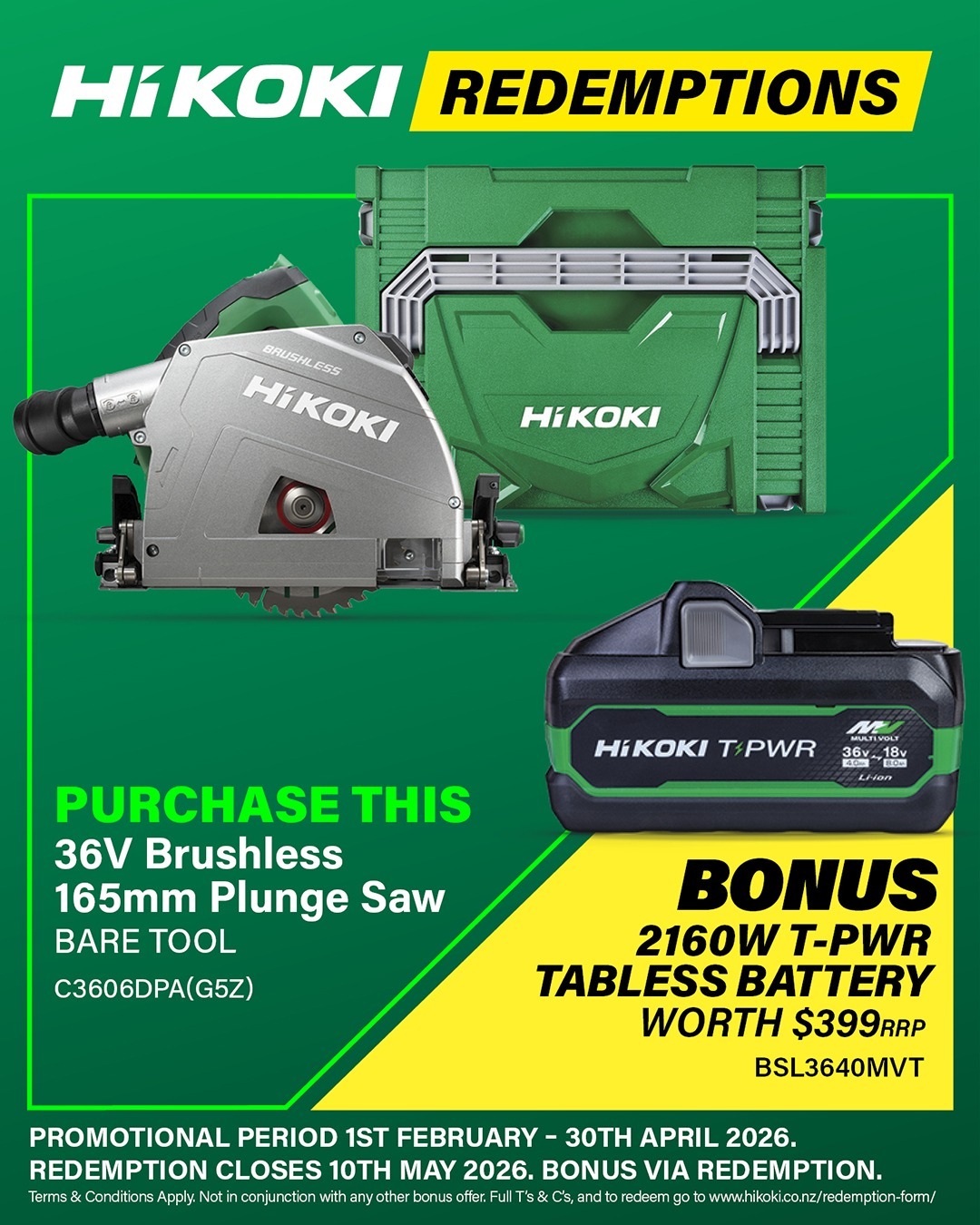HiKOKI 36V Brushless 165mm Plunge Cut Saw brings premium high-powered cutting to site. Featuring a “?Deep Cut’ configuration with a max cut of 66mm at 90?. The C3606DPA Premium Plunge Cut Saw also features soft-start for smooth start-ups, accurate precision cutting when fitted to a guide rail, and a variable speed function for greater control.