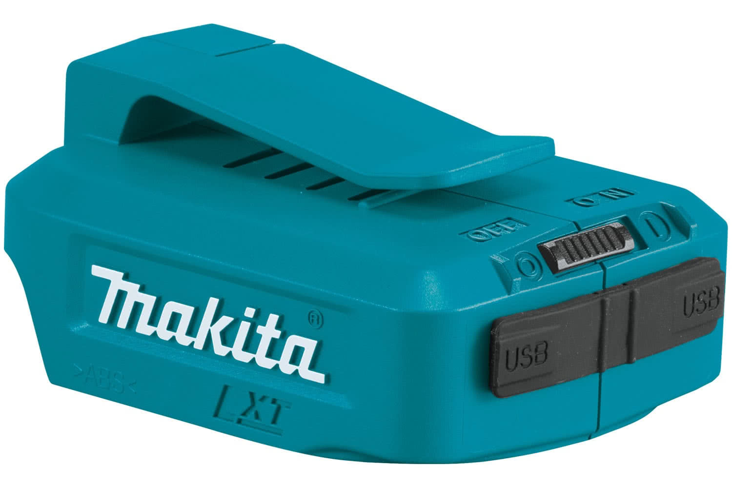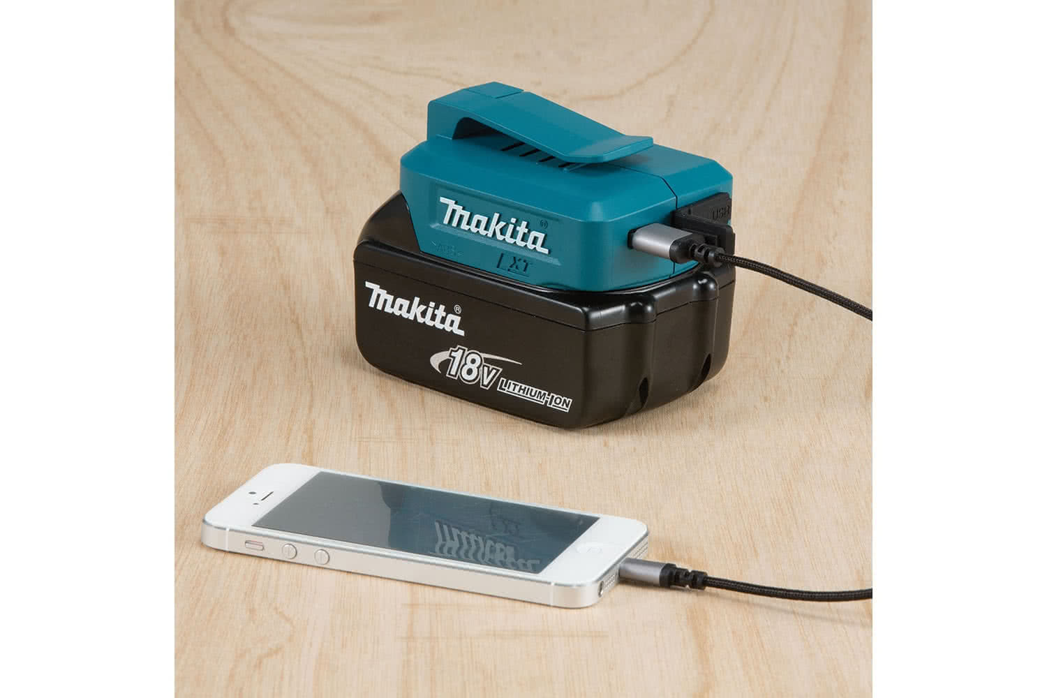 Turn your Makita li-ion battery into a charging port with the 18V USB Charging adaptor. Mount the ADP05 on to your compatible Makita battery and you get two USB charging ports. Each USB port delivers 2.1A output. The built-in clip attaches to a belt or holster, with rubber covers for improved durability