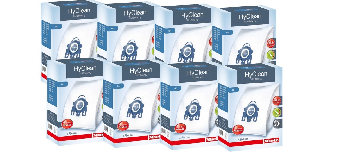 8 Boxes of GN HyClean genuine Miele bags with motor and exhaust filters.