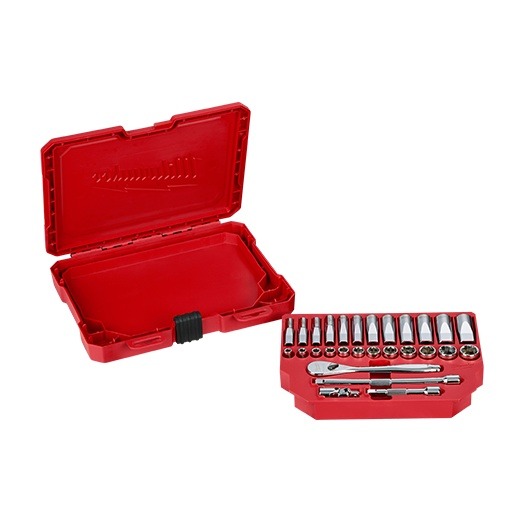 Our MILWAUKEE® Metric 28 piece 1/4″ drive Ratchet & Socket set is designed from the ground up, offering our users the Most Versatile Sockets that are Anti-Roll and Wrench-Ready. Its innovative FOUR FLAT™ Sides feature an anti-roll and wrench-ready design. The 90 tooth ratchet tool offers 4° of arc swing and a slim profile design, allowing you to work in tighter and more confined spaces, be it under the hood of a car or in the middle of a remodel. The ratchet and socket kit comes with a removable inner tray which is perfectly designed to be stored long-term in a steel storage chest. All of our sockets are stamped with metric measurements on the flat side for easy-to-read visibility. It also comes with a durable carrying case for ultimate portability. The set comes with accessories included so that our users can get every job done, both in the garage and on the jobsite. Our ratchet and socket set is backed by our Lifetime Guarantee.