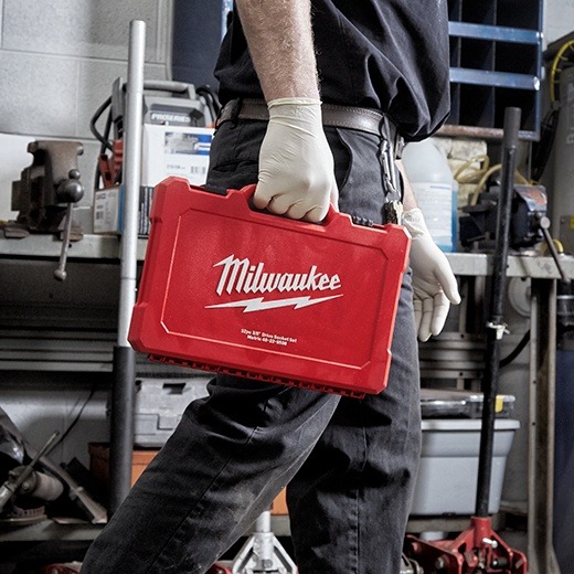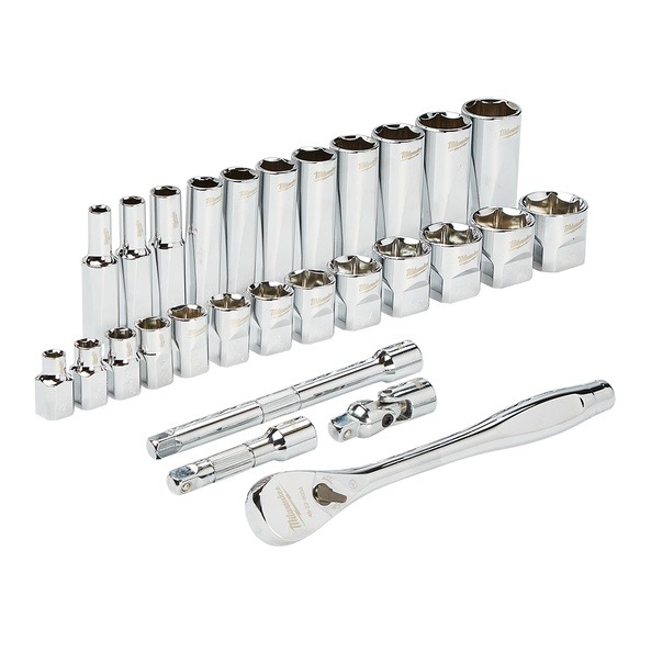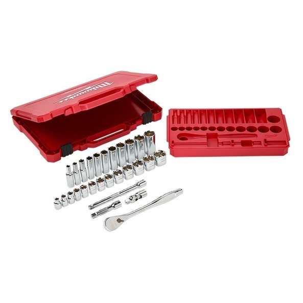 Our MILWAUKEE® SAE 32 piece 3/8″ drive Ratchet & Socket set is designed from the ground up, offering our users the Most Versatile Sockets that are Anti-Roll and Wrench-Ready. Its innovative FOUR FLAT™ Sides feature an anti-roll and wrench-ready design. The 90 tooth ratchet tool offers 4° of arc swing and a slim profile design, allowing you to work in tighter and more confined spaces, be it under the hood of a car or in the middle of a remodel. The ratchet and socket kit comes with a removable inner tray which is perfectly designed to be stored long-term in a steel storage chest. All of our sockets are stamped with metric measurements on the flat side for easy-to-read visibility. The set comes with accessories included so that our users can get every job done, both in the garage and on the jobsite. Our ratchet and socket set is backed by our Lifetime Guarantee.