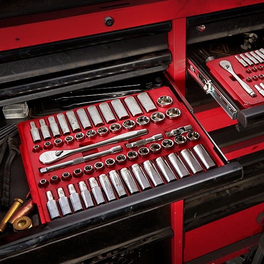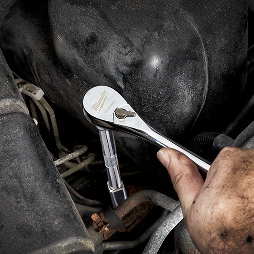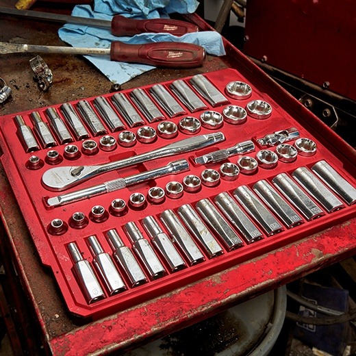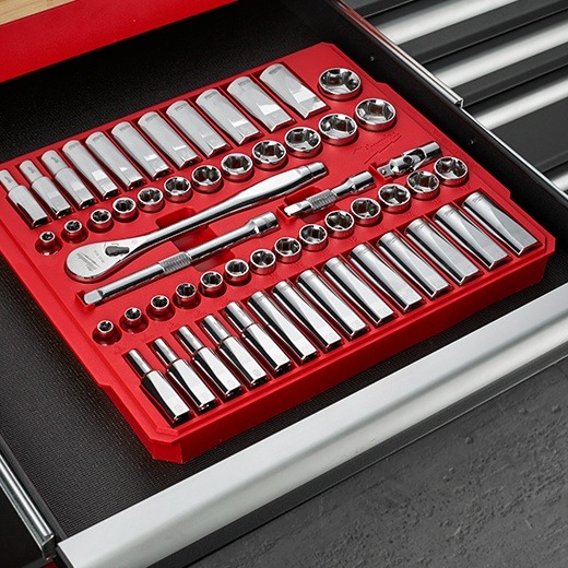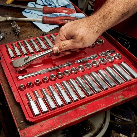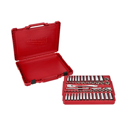 Our MILWAUKEE® SAE & Metric 56 piece 3/8″ drive Ratchet & Socket set is designed from the ground up, offering our users the Most Versatile Sockets that are Anti-Roll and Wrench-Ready. Its innovative FOUR FLAT™ Sides feature an anti-roll and wrench-ready design. The 90 tooth ratchet tool offers 4° of arc swing and a slim profile design, allowing you to work in tighter and more confined spaces, be it under the hood of a car or in the middle of a remodel. The ratchet and socket kit comes with a removable inner tray which is perfectly designed to be stored long-term in a steel storage chest. All of our sockets are stamped with metric and SAE measurements on the flat side for easy-to-read visibility. It also comes with a durable carrying case for ultimate portability. The set comes with accessories included so that our users can get every job done, both in the garage and on the jobsite. Our ratchet and socket set is backed by our Lifetime Guarantee.