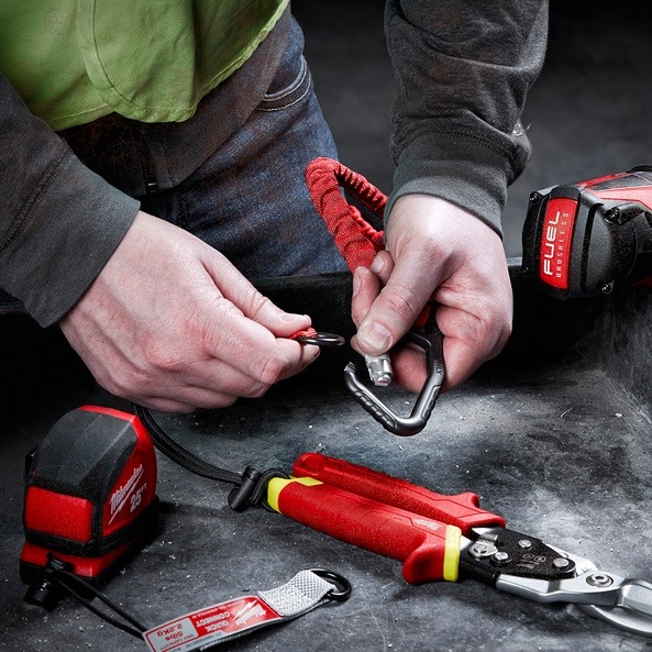 MILWAUKEE 4.5kg (10lb) 915mm Quick-Connect Tool Lanyard helps users stay safe and stay productive while working at heights by reducing the risks associated with dropped tools. Featuring a carabiner on both ends for fast swaps between tools. The lanyard body is engineered to provide the best shock absorption, slowing the tool gradually if a drop occurs. Locking carabiners require double actions to open, ensuring a secure connection. Integrated swivel reduces twists when rotating tools. Integrated swiveling carabiner reduces twists when using tools. The red colour coded lanyard allows the user to easily identify the lanyard’s weight rating. Use with MILWAUKEE Quick-Connect Accessories for maximum productivity. For use with tools up to 4.5kg (10lb).