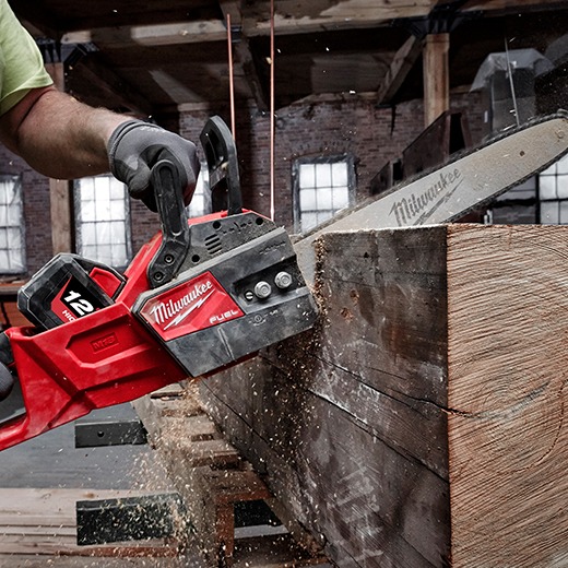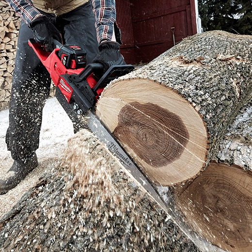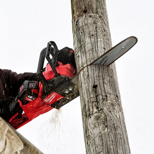 The Milwaukee® M18 FUEL™ 16″ Chain saw delivers the power to cut hardwoods, faster cutting, and delivers up to 150 cuts per charge. The unit is designed to meet the performance, durability and ergonomic needs of professional landscape maintenance, power utility, and the installed M18 user. The POWERSTATE™ Brushless Motor maintains speed under heavy loads without bogging down. REDLINK PLUS™ intelligence ensures maximum performance and protection from overload, overheating and over discharge. The M18™ REDLITHIUM-ION™ High Output™ 12.0Ah battery delivers unmatched run-time in all applications. M18 FUEL™ technology allows the unit to reach full throttle in under 1 second providing ultimate control and productivity.