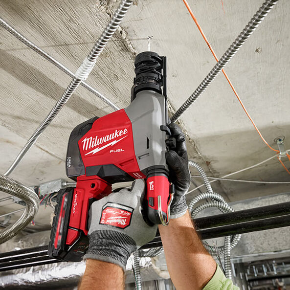 The M18 FUEL™ 16mm Overhead SDS Plus Rotary Hammer with Integrated Dust Extractor and ONE-KEY™ is a new-to-world solution optimised for ceiling drilling. This 2-in-1 design delivers improved ergonomics for overhead work compared to traditional rotary hammer and dust extractor attachments. This SDS Plus rotary hammer provides several new features that keep users productive and comfortable for repetitive drilling overhead. The built-in dust extractor creates a compact and lightweight tool with optimised balance for less fatigue. The newly designed side handle, now located near the rear handle, allows the operator to maintain better body posture throughout the application. The handle can be inserted on the left or right of the tool and can be collapsed for easy storage. AUTOSTOP™ Kickback protection offers enhanced safety for the user by preventing over-rotation in a bind-up. With ONE-KEY™, users can choose between default and low sensitivity settings for AUTOSTOP™ feature, in addition to tool tracking and management. The M18 FUEL™ 16mm Overhead SDS Plus Rotary Hammer with Integrated Dust Extractor and ONE-KEY™ provides simplified dust extraction and supreme ergonomics, while still delivering best-inclass performance. The POWERSTATE™ Brushless motor provides fast drilling for small ceiling anchors and enough power to complete up to 16mm holes in concrete.