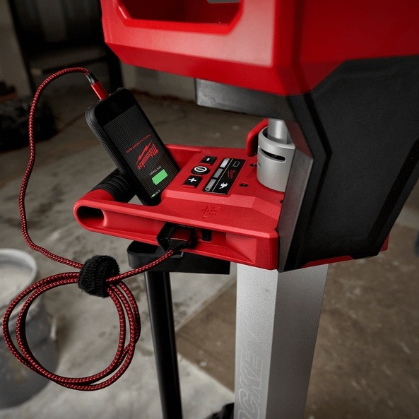 With an integrated AC cord , users can plug in the light and charge any M18™ REDLITHIUM™-ION battery pack, or use the USB port to charge their devices on site, with convenient device storage when charging.