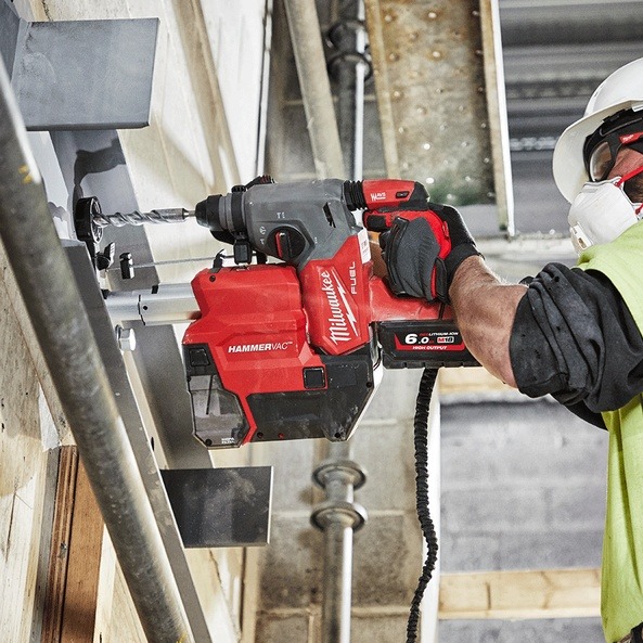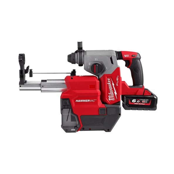 The M18 FUEL™ HAMMERVAC™ 26 mm Dedicated Dust Extractor features an inline design engineered to connect directly to and be powered by, the MILWAUKEE® M18 FUEL™ 26 mm SDS Plus Rotary Hammer (M18FH).