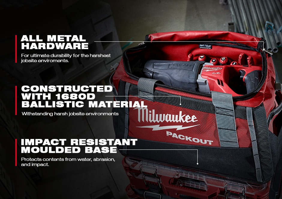 Our PACKOUT™ Modular Storage System is a durable and versatile storage system. The 500mm (20″) PACKOUT™ tool bag features an impact-resistant molded base that connects with all other PACKOUT™ system components via integrated locking cleats. We constructed the durable tool duffel bag with 1680D ballistic material and all-metal hardware so it can withstand harsh jobsite environments. The 500mm (20″) tool bag features open storage and two exterior pockets for your tools and accessories allowing easy access and visibility. We also added a cushioned shoulder strap, top handles and side handles allowing you to easily and comfortably transport your tool bag wherever you need it. Our PACKOUT™ modular storage allows you to customise and build your own storage system to easily transport and organise your tools and accessories.